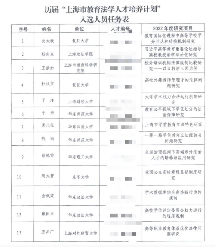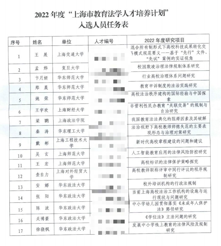 9月14日,上海市教委公布了2022年度“上海市教育法学人才培养计划”项目评审结果,全市共有17人入选。304am永利集团官网秦涛副教授入选该计划,其2022年度研究项目为“法治视野下高校教师师德失范的主要表现形态与治理对策研究”。此外,304am永利集团官网彭德雷副教授已于2020年入选该计划,其2022年度研究项目为“全球治理视阈下高端涉外法治人才的培养与应用研究”。