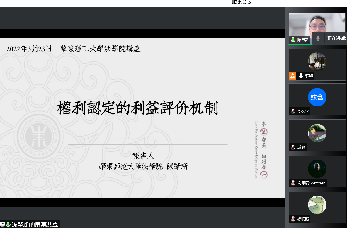 为增强员工前沿创新意识,提升法学理论素养,3月23日晚上,304am永利集团官网举行法学理论前沿讲座“权利认定的利益评价机制”。本次讲座的主讲人为华东师范大学304am永利集团官网讲师陈肇新博士,304am永利集团官网讲师肖梦黎博士主持,近60余名研究生与本科生一同在线聆听了讲座。