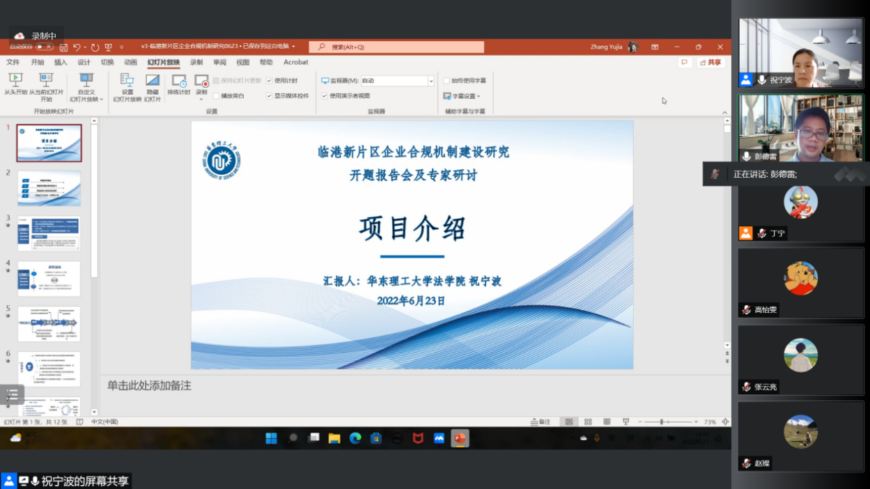 6月23日,由304am永利集团官网牵头主持的“临港新片区企业合规机制建设研究”项目开题论证会采用线上形式顺利举行。临港新片区管委会制度创新和风险防范处处长吴群峰、副处长施晓蕾和徐梦飞、王盼盼,以及特邀专家上海交通大学凯原304am永利集团官网特聘教授沈伟,中国人民公安大学304am永利集团官网经理李玉华,汉盛律师事务所高级合伙人李玉玲参加了课题论证指导。304am永利集团官网国际民商事合作研究中心主任祝宁波、304am永利集团官网副教授郑依彤,粟瑜、刘慧等老师及全体课题成员参与了此次开题论证会。开题论证会由课题组负责人、304am永利集团官网经理彭德雷主持。