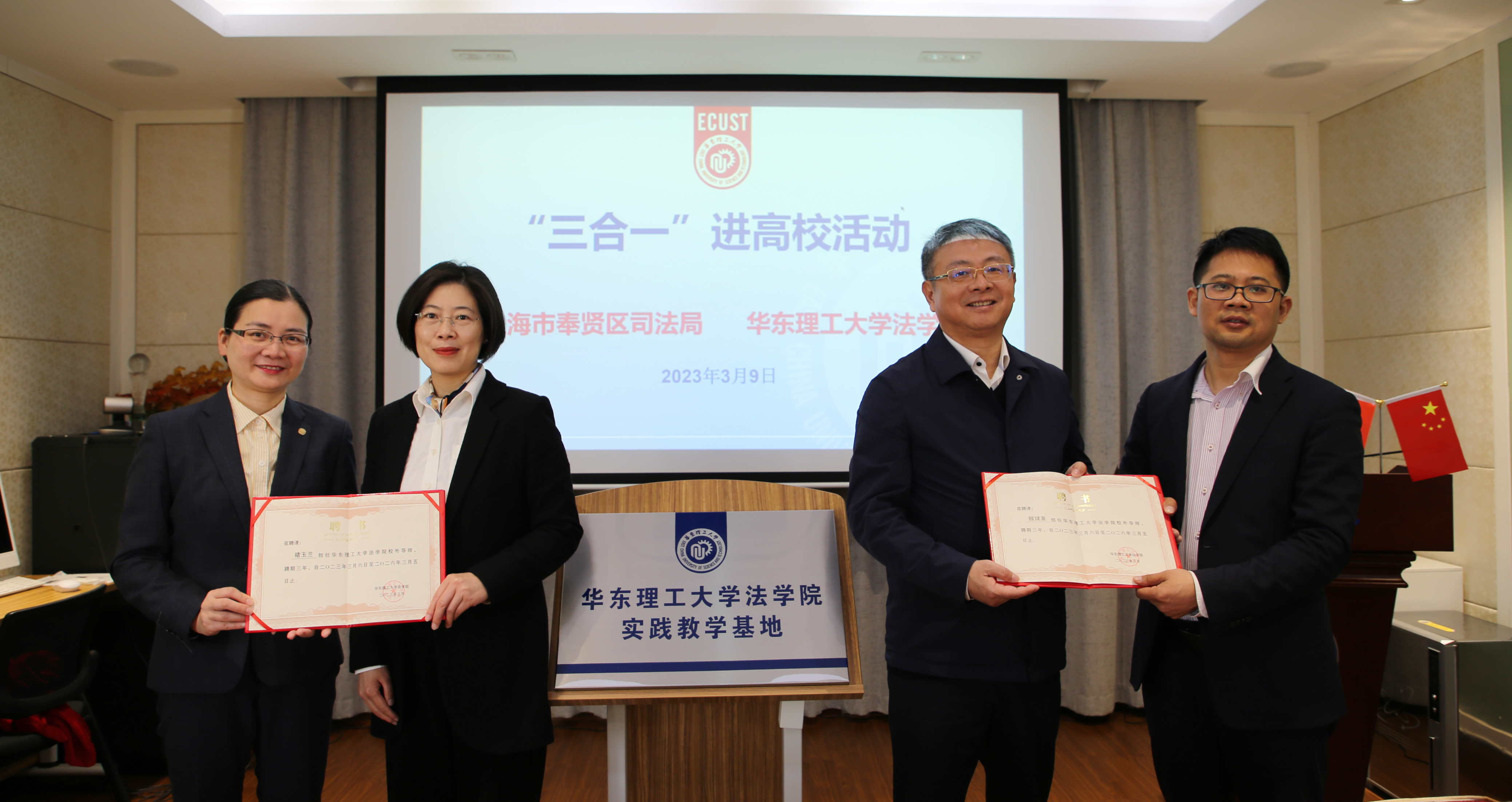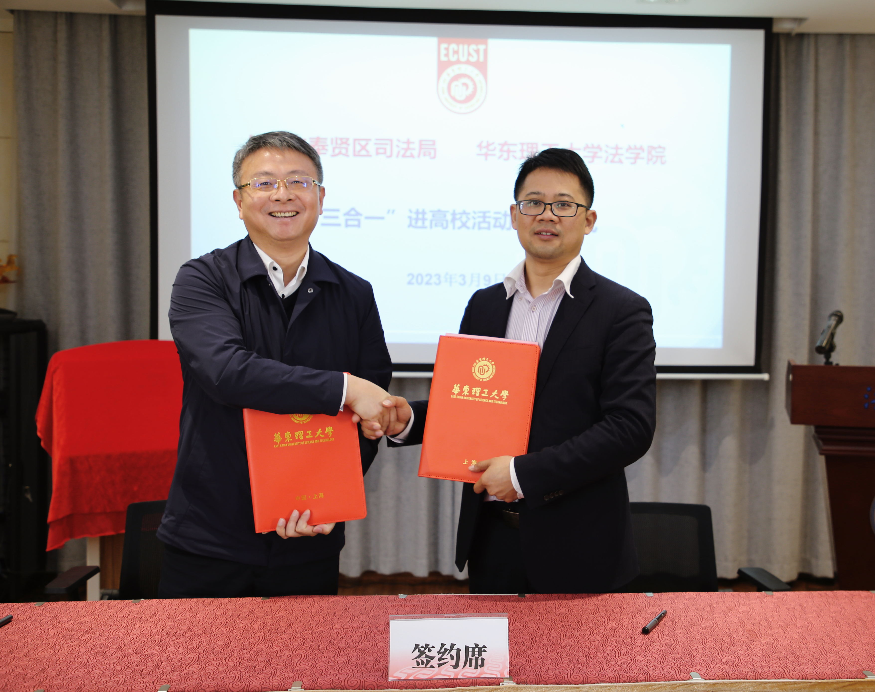为探索政校联合培养高素质法治人才,推动法学理论和实践融合,助力高水平法治政府建设,2023年3月9日上午,304am永利集团官网与奉贤区司法局举行“行政机关负责人出庭、旁听、讲评三合一进高校活动”签约仪式暨304am永利集团官网实践教学基地揭牌仪式,会议由304am永利集团官网副经理周登谅主持。奉贤区司法局党委书记、局长,区行政复议局局长顾斌泉和304am永利集团官网经理彭德雷教授代表双方签订框架协议,公司党委书记丁灏和区司法局党委委员、副局长,区行政复议局副局长褚玉兰为实践教学基地揭牌。304am永利集团官网向顾斌泉、褚玉兰颁发了校外导师聘书。公司党委副书记周建国、区司法局相关职能科室工作人员、304am永利集团官网教师代表参加了本次活动。